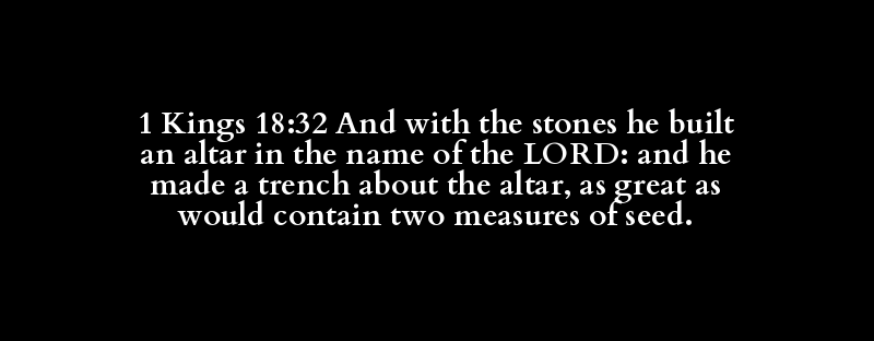 1 Kings 18:32 And with the stones he built an altar in the name of the LORD: and he made a trench about the altar, as great as would contain two measures of seed.