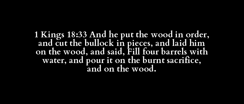 1 Kings 18:33 And he put the wood in order, and cut the bullock in pieces, and laid him on the wood, and said, Fill four barrels with water, and pour it on the burnt sacrifice, and on the wood.