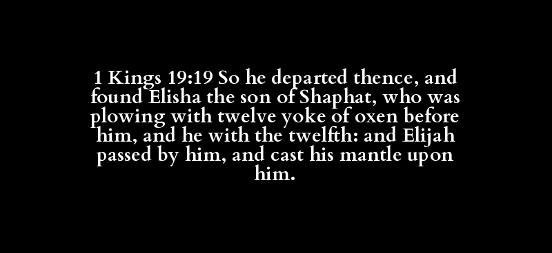 1 Kings 19:19 So he departed thence, and found Elisha the son of Shaphat, who was plowing with twelve yoke of oxen before him, and he with the twelfth: and Elijah passed by him, and cast his mantle upon him.