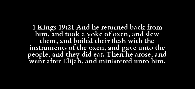 1 Kings 19:21 And he returned back from him, and took a yoke of oxen, and slew them, and boiled their flesh with the instruments of the oxen, and gave unto the people, and they did eat. Then he arose, and went after Elijah, and ministered unto him.