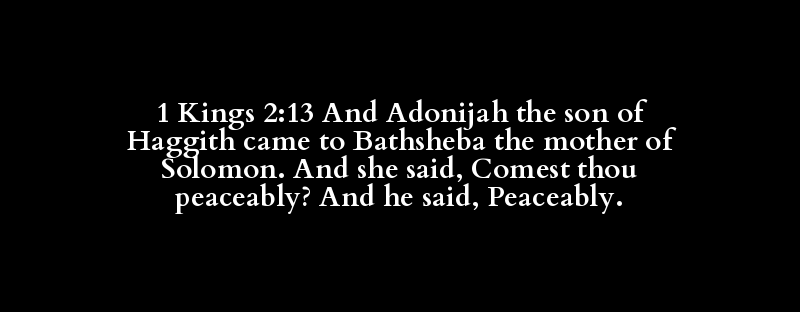 1 Kings 2:13 And Adonijah the son of Haggith came to Bathsheba the mother of Solomon. And she said, Comest thou peaceably? And he said, Peaceably.