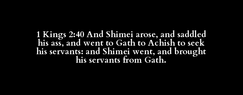1 Kings 2:40 And Shimei arose, and saddled his ass, and went to Gath to Achish to seek his servants: and Shimei went, and brought his servants from Gath.