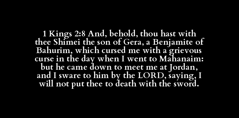 1 Kings 2:8 And, behold, thou hast with thee Shimei the son of Gera, a Benjamite of Bahurim, which cursed me with a grievous curse in the day when I went to Mahanaim: but he came down to meet me at Jordan, and I sware to him by the LORD, saying, I will not put thee to death with the sword.