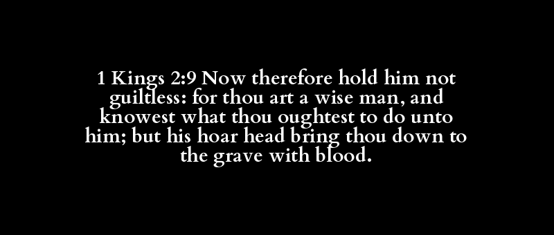 1 Kings 2:9 Now therefore hold him not guiltless: for thou art a wise man, and knowest what thou oughtest to do unto him; but his hoar head bring thou down to the grave with blood.