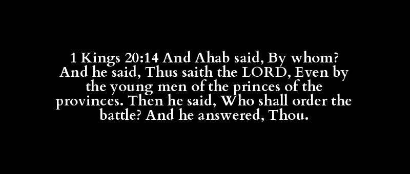 1 Kings 20:14 And Ahab said, By whom? And he said, Thus saith the LORD, Even by the young men of the princes of the provinces. Then he said, Who shall order the battle? And he answered, Thou.