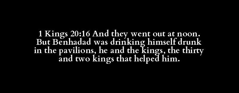 1 Kings 20:16 And they went out at noon. But Benhadad was drinking himself drunk in the pavilions, he and the kings, the thirty and two kings that helped him.