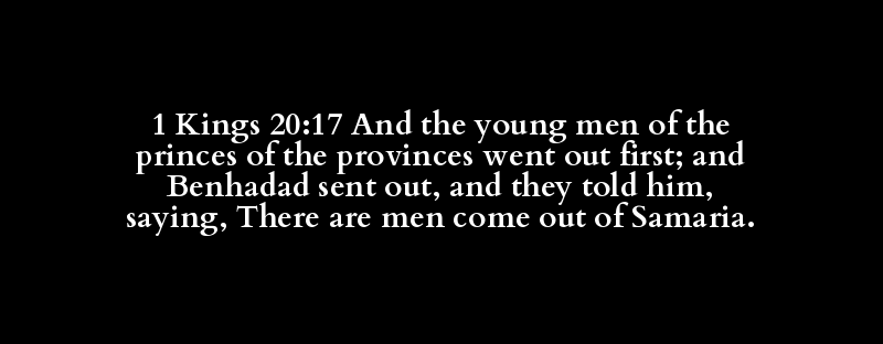 1 Kings 20:17 And the young men of the princes of the provinces went out first; and Benhadad sent out, and they told him, saying, There are men come out of Samaria.