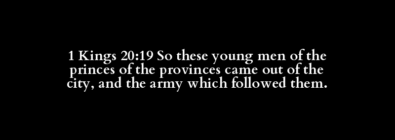 1 Kings 20:19 So these young men of the princes of the provinces came out of the city, and the army which followed them.