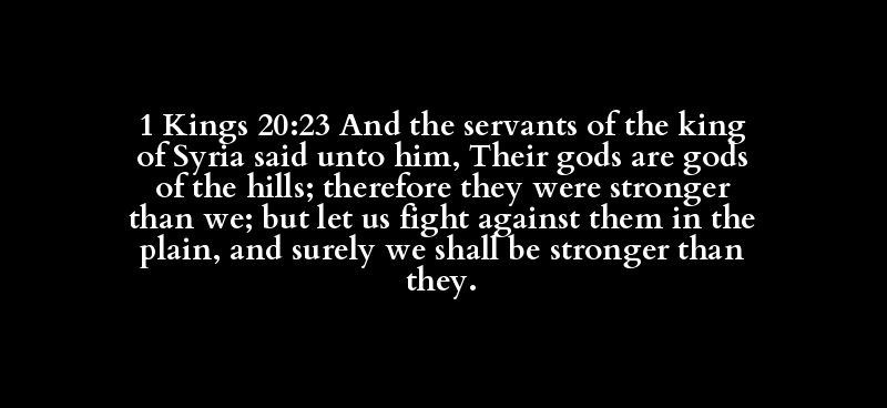 1 Kings 20:23 And the servants of the king of Syria said unto him, Their gods are gods of the hills; therefore they were stronger than we; but let us fight against them in the plain, and surely we shall be stronger than they.