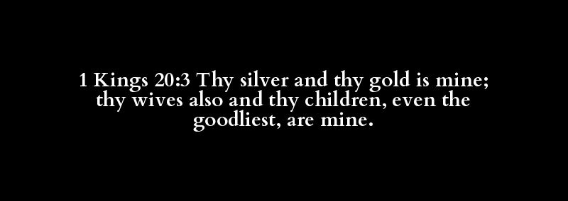 1 Kings 20:3 Thy silver and thy gold is mine; thy wives also and thy children, even the goodliest, are mine.