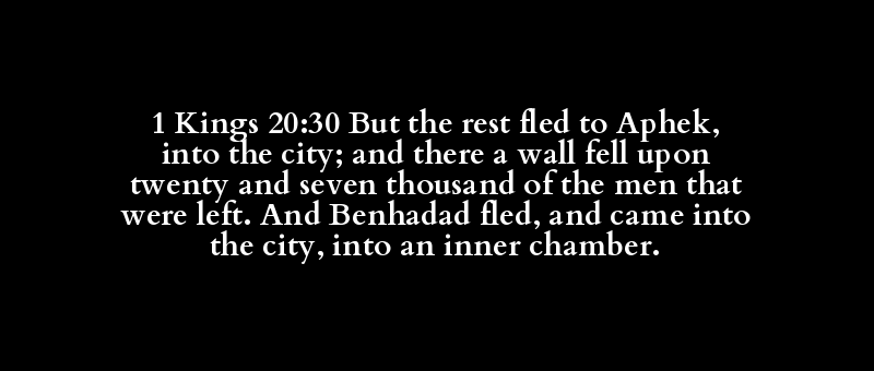 1 Kings 20:30 But the rest fled to Aphek, into the city; and there a wall fell upon twenty and seven thousand of the men that were left. And Benhadad fled, and came into the city, into an inner chamber.