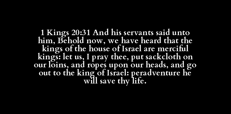 1 Kings 20:31 And his servants said unto him, Behold now, we have heard that the kings of the house of Israel are merciful kings: let us, I pray thee, put sackcloth on our loins, and ropes upon our heads, and go out to the king of Israel: peradventure he will save thy life.