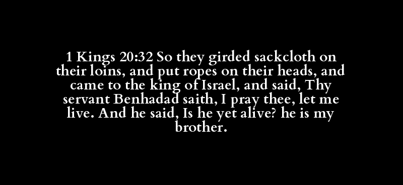 1 Kings 20:32 So they girded sackcloth on their loins, and put ropes on their heads, and came to the king of Israel, and said, Thy servant Benhadad saith, I pray thee, let me live. And he said, Is he yet alive? he is my brother.