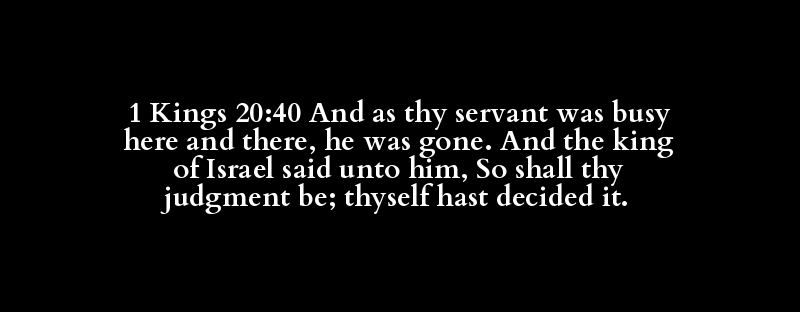 1 Kings 20:40 And as thy servant was busy here and there, he was gone. And the king of Israel said unto him, So shall thy judgment be; thyself hast decided it.