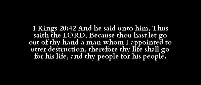 1 Kings 20:42 And he said unto him, Thus saith the LORD, Because thou hast let go out of thy hand a man whom I appointed to utter destruction, therefore thy life shall go for his life, and thy people for his people.