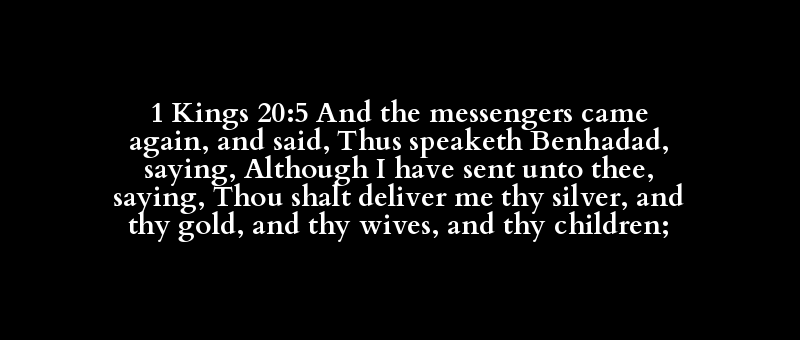 1 Kings 20:5 And the messengers came again, and said, Thus speaketh Benhadad, saying, Although I have sent unto thee, saying, Thou shalt deliver me thy silver, and thy gold, and thy wives, and thy children;