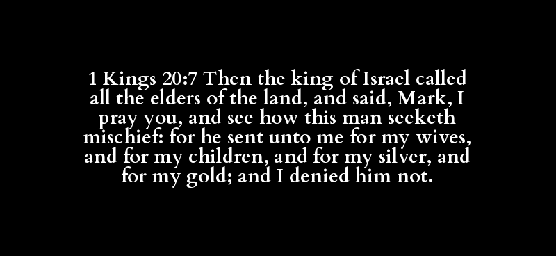 1 Kings 20:7 Then the king of Israel called all the elders of the land, and said, Mark, I pray you, and see how this man seeketh mischief: for he sent unto me for my wives, and for my children, and for my silver, and for my gold; and I denied him not.