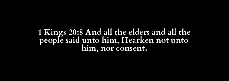 1 Kings 20:8 And all the elders and all the people said unto him, Hearken not unto him, nor consent.