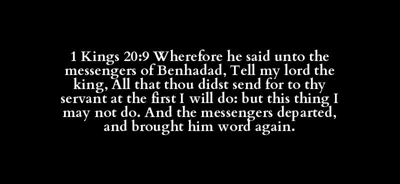 1 Kings 20:9 Wherefore he said unto the messengers of Benhadad, Tell my lord the king, All that thou didst send for to thy servant at the first I will do: but this thing I may not do. And the messengers departed, and brought him word again.