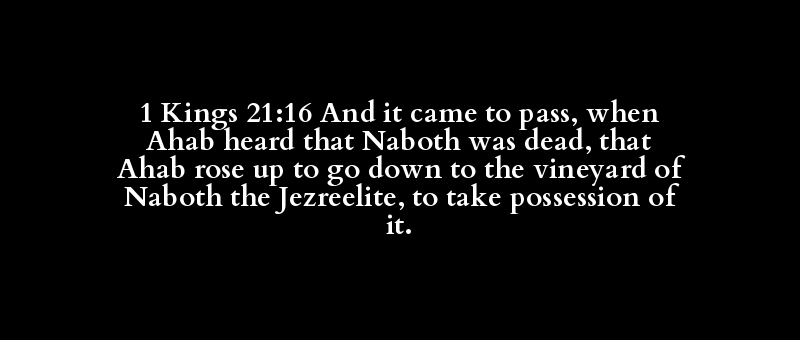 1 Kings 21:16 And it came to pass, when Ahab heard that Naboth was dead, that Ahab rose up to go down to the vineyard of Naboth the Jezreelite, to take possession of it.