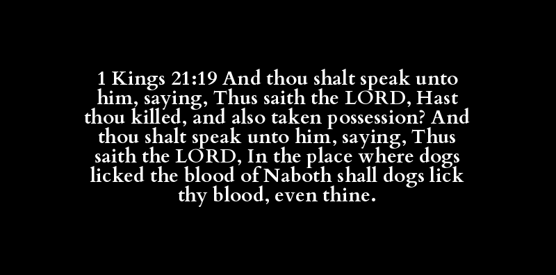 1 Kings 21:19 And thou shalt speak unto him, saying, Thus saith the LORD, Hast thou killed, and also taken possession? And thou shalt speak unto him, saying, Thus saith the LORD, In the place where dogs licked the blood of Naboth shall dogs lick thy blood, even thine.
