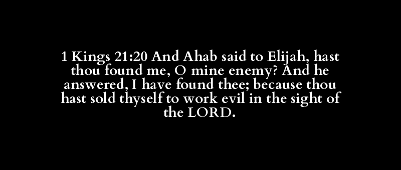 1 Kings 21:20 And Ahab said to Elijah, hast thou found me, O mine enemy? And he answered, I have found thee; because thou hast sold thyself to work evil in the sight of the LORD.