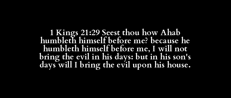 1 Kings 21:29 Seest thou how Ahab humbleth himself before me? because he humbleth himself before me, I will not bring the evil in his days: but in his son's days will I bring the evil upon his house.