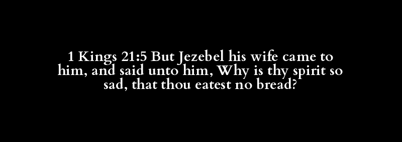 1 Kings 21:5 But Jezebel his wife came to him, and said unto him, Why is thy spirit so sad, that thou eatest no bread?
