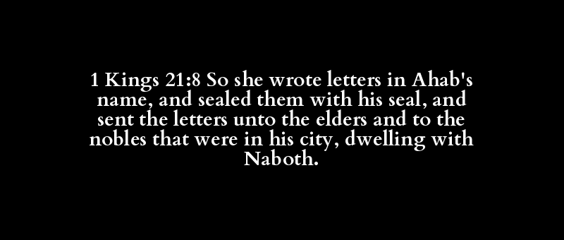 1 Kings 21:8 So she wrote letters in Ahab's name, and sealed them with his seal, and sent the letters unto the elders and to the nobles that were in his city, dwelling with Naboth.