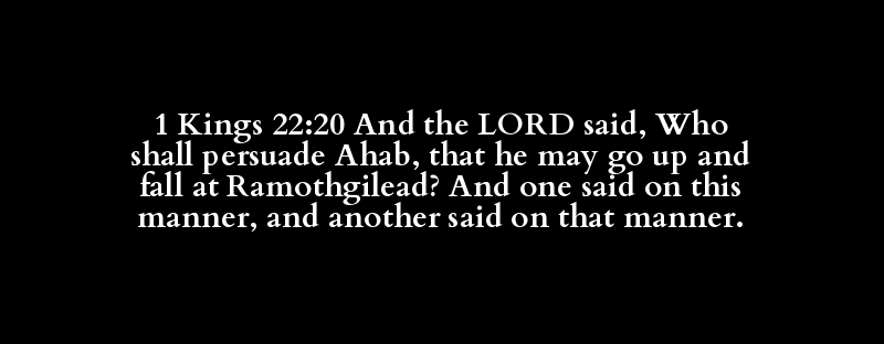 1 Kings 22:20 And the LORD said, Who shall persuade Ahab, that he may go up and fall at Ramothgilead? And one said on this manner, and another said on that manner.