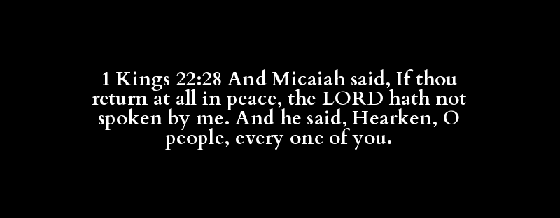 1 Kings 22:28 And Micaiah said, If thou return at all in peace, the LORD hath not spoken by me. And he said, Hearken, O people, every one of you.