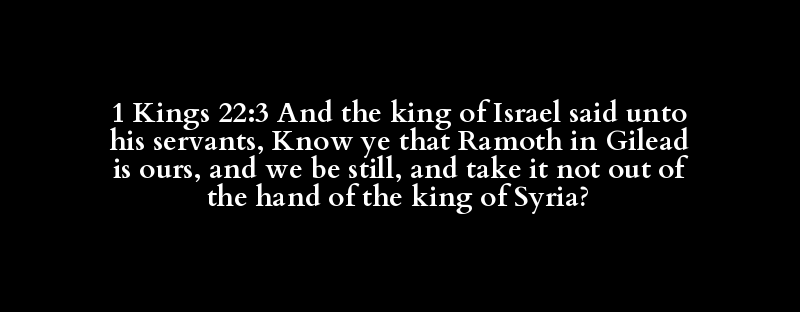 1 Kings 22:3 And the king of Israel said unto his servants, Know ye that Ramoth in Gilead is ours, and we be still, and take it not out of the hand of the king of Syria?