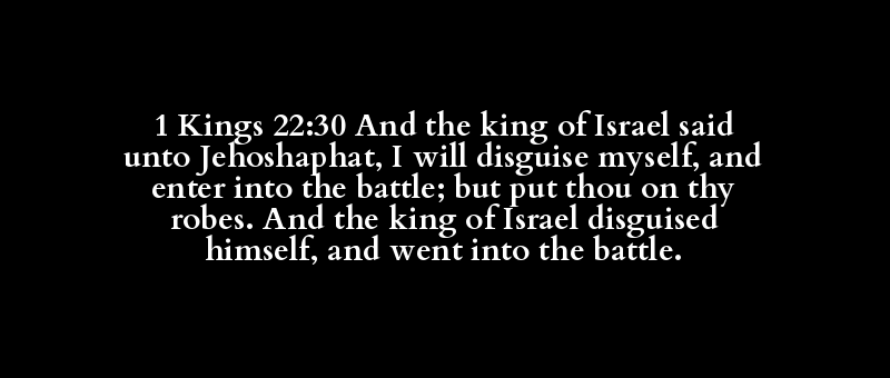1 Kings 22:30 And the king of Israel said unto Jehoshaphat, I will disguise myself, and enter into the battle; but put thou on thy robes. And the king of Israel disguised himself, and went into the battle.