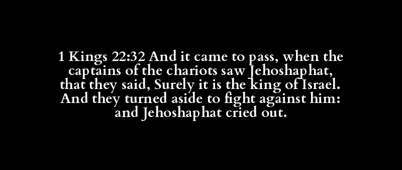 1 Kings 22:32 And it came to pass, when the captains of the chariots saw Jehoshaphat, that they said, Surely it is the king of Israel. And they turned aside to fight against him: and Jehoshaphat cried out.