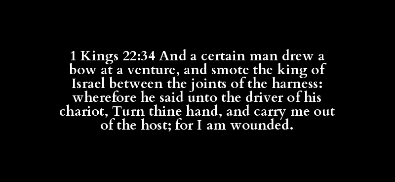 1 Kings 22:34 And a certain man drew a bow at a venture, and smote the king of Israel between the joints of the harness: wherefore he said unto the driver of his chariot, Turn thine hand, and carry me out of the host; for I am wounded.