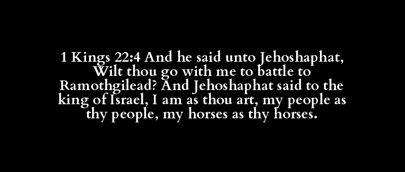 1 Kings 22:4 And he said unto Jehoshaphat, Wilt thou go with me to battle to Ramothgilead? And Jehoshaphat said to the king of Israel, I am as thou art, my people as thy people, my horses as thy horses.