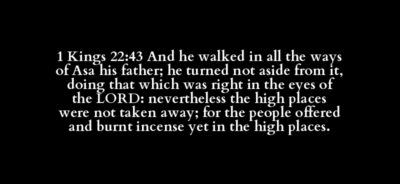 1 Kings 22:43 And he walked in all the ways of Asa his father; he turned not aside from it, doing that which was right in the eyes of the LORD: nevertheless the high places were not taken away; for the people offered and burnt incense yet in the high places.