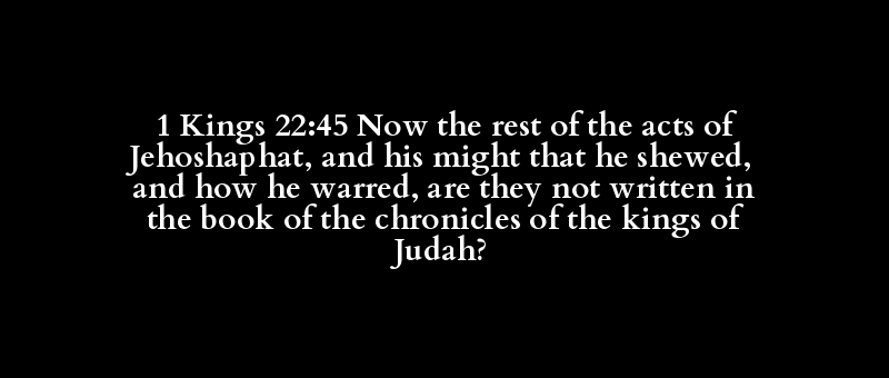 1 Kings 22:45 Now the rest of the acts of Jehoshaphat, and his might that he shewed, and how he warred, are they not written in the book of the chronicles of the kings of Judah?