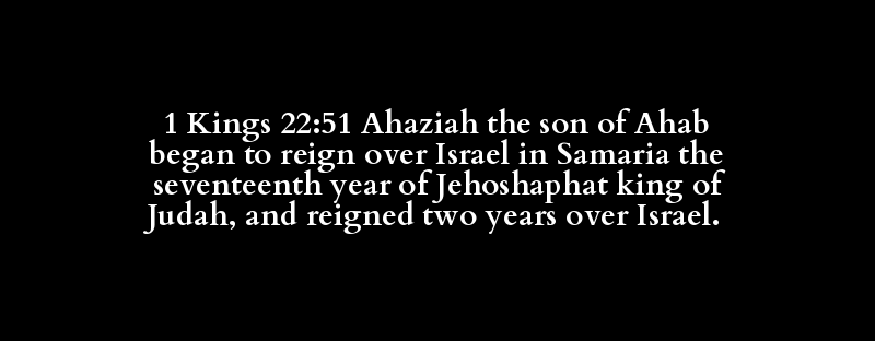 1 Kings 22:51 Ahaziah the son of Ahab began to reign over Israel in Samaria the seventeenth year of Jehoshaphat king of Judah, and reigned two years over Israel.