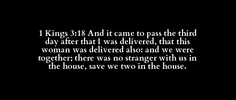 1 Kings 3:18 And it came to pass the third day after that I was delivered, that this woman was delivered also: and we were together; there was no stranger with us in the house, save we two in the house.