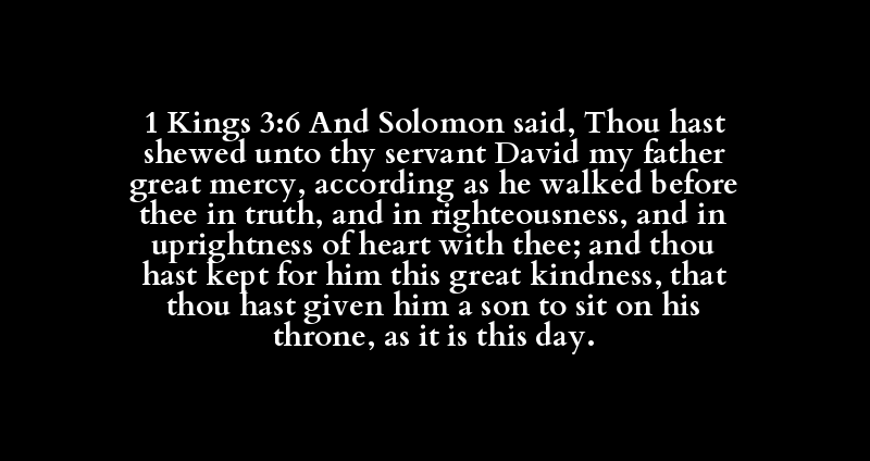 1 Kings 3:6 And Solomon said, Thou hast shewed unto thy servant David my father great mercy, according as he walked before thee in truth, and in righteousness, and in uprightness of heart with thee; and thou hast kept for him this great kindness, that thou hast given him a son to sit on his throne, as it is this day.