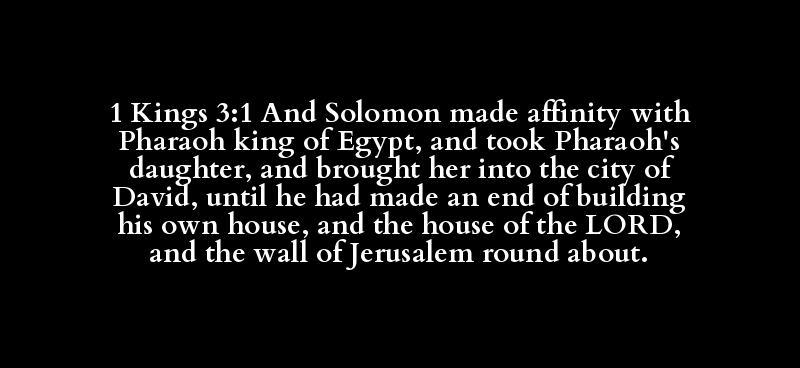1 Kings 3:1 And Solomon made affinity with Pharaoh king of Egypt, and took Pharaoh's daughter, and brought her into the city of David, until he had made an end of building his own house, and the house of the LORD, and the wall of Jerusalem round about.