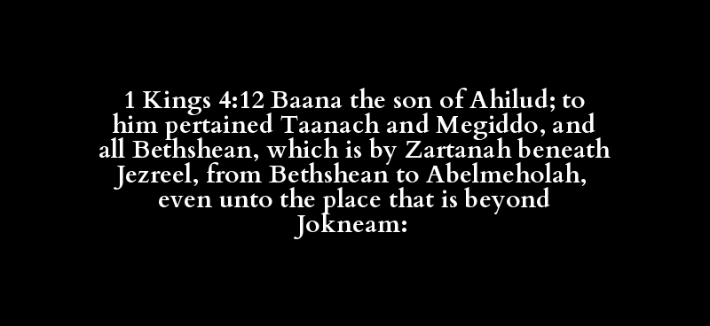 1 Kings 4:12 Baana the son of Ahilud; to him pertained Taanach and Megiddo, and all Bethshean, which is by Zartanah beneath Jezreel, from Bethshean to Abelmeholah, even unto the place that is beyond Jokneam: