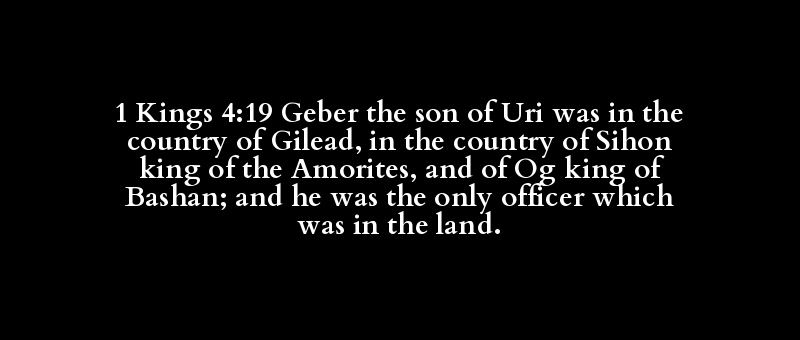 1 Kings 4:19 Geber the son of Uri was in the country of Gilead, in the country of Sihon king of the Amorites, and of Og king of Bashan; and he was the only officer which was in the land.