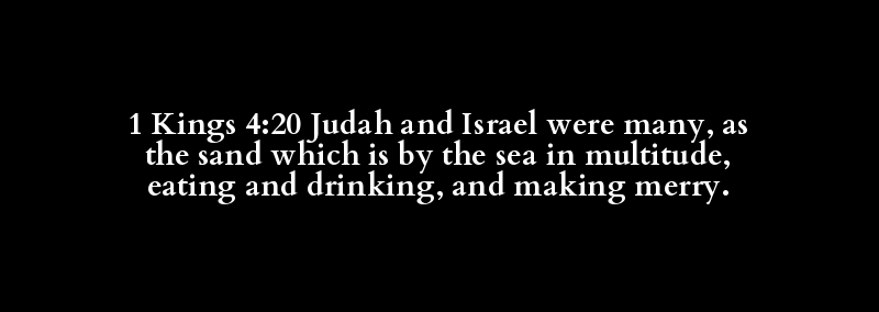 1 Kings 4:20 Judah and Israel were many, as the sand which is by the sea in multitude, eating and drinking, and making merry.