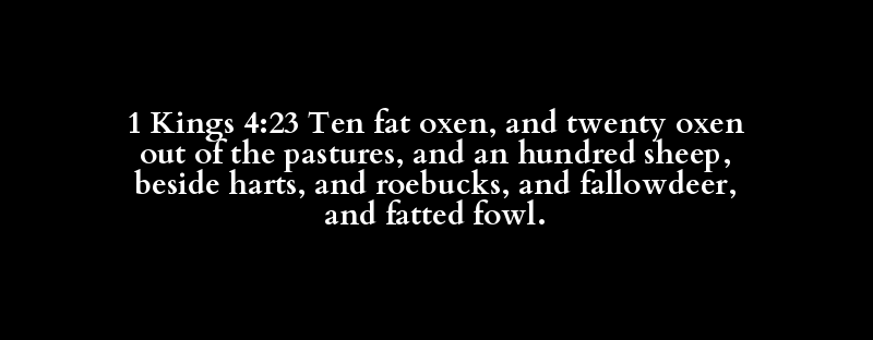 | עֶשֶׂר | בָּרִיא | בָּקָר | עֶשְׂרִים | בָּקָר | רְעִי | מֵאָה | צֹאן | אַיָּל | צְבִי | יַחְמוּר | אָבַס | בַּרְבֻּר |