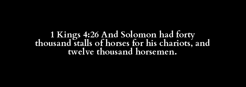 1 Kings 4:26 And Solomon had forty thousand stalls of horses for his chariots, and twelve thousand horsemen.