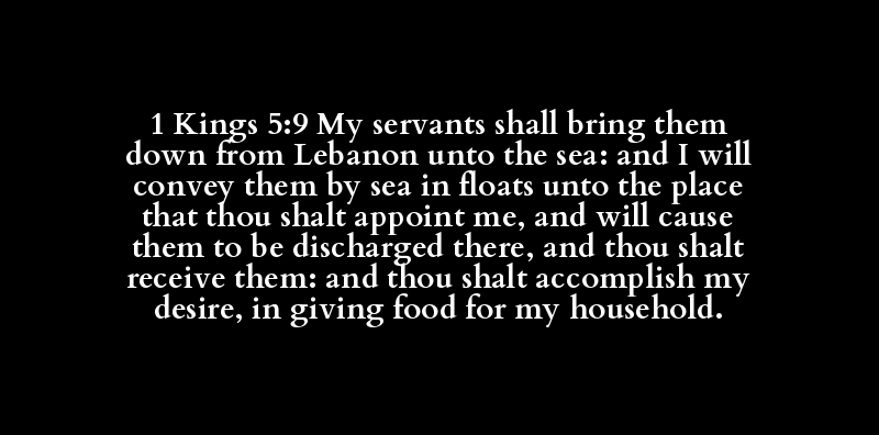 1 Kings 5:9 My servants shall bring them down from Lebanon unto the sea: and I will convey them by sea in floats unto the place that thou shalt appoint me, and will cause them to be discharged there, and thou shalt receive them: and thou shalt accomplish my desire, in giving food for my household.