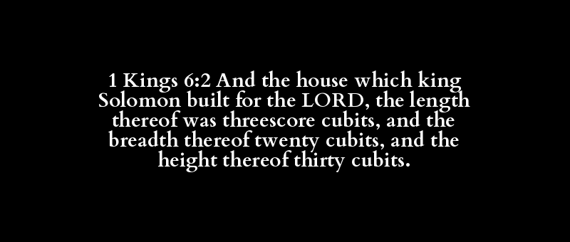 1 Kings 6:2 And the house which king Solomon built for the LORD, the length thereof was threescore cubits, and the breadth thereof twenty cubits, and the height thereof thirty cubits.
