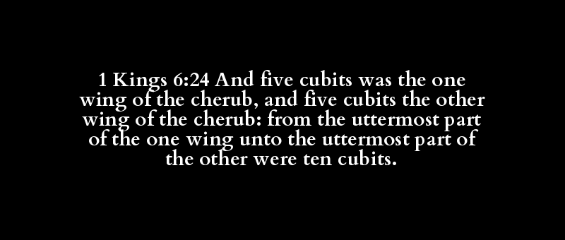 1 Kings 6:24 And five cubits was the one wing of the cherub, and five cubits the other wing of the cherub: from the uttermost part of the one wing unto the uttermost part of the other were ten cubits.